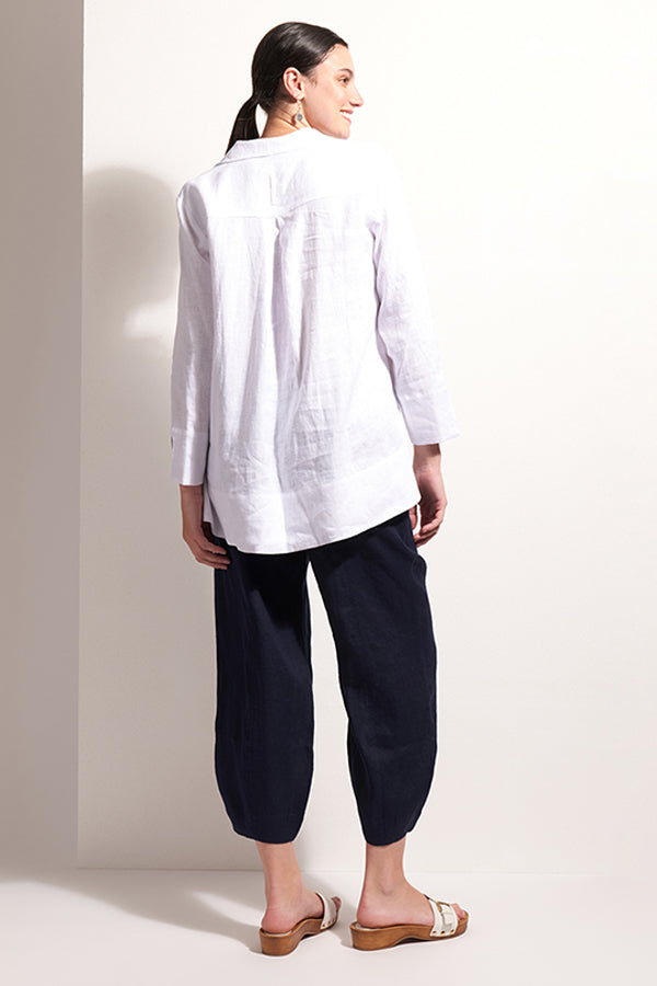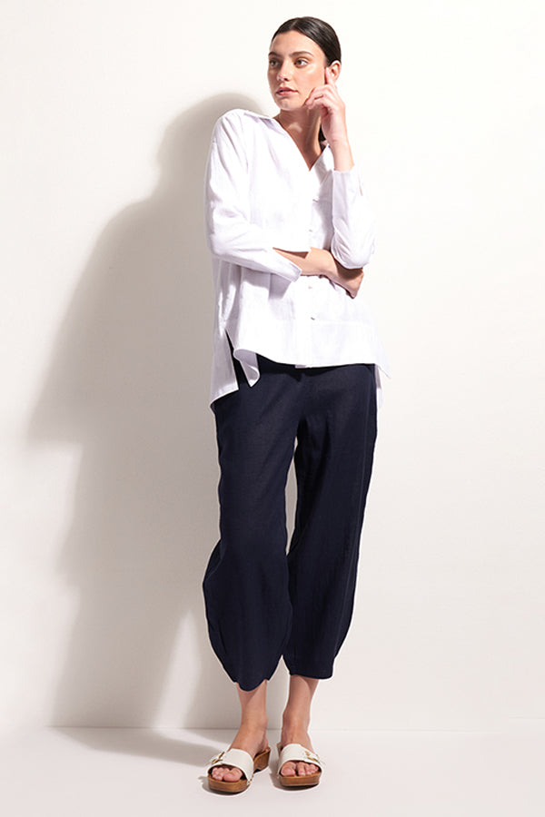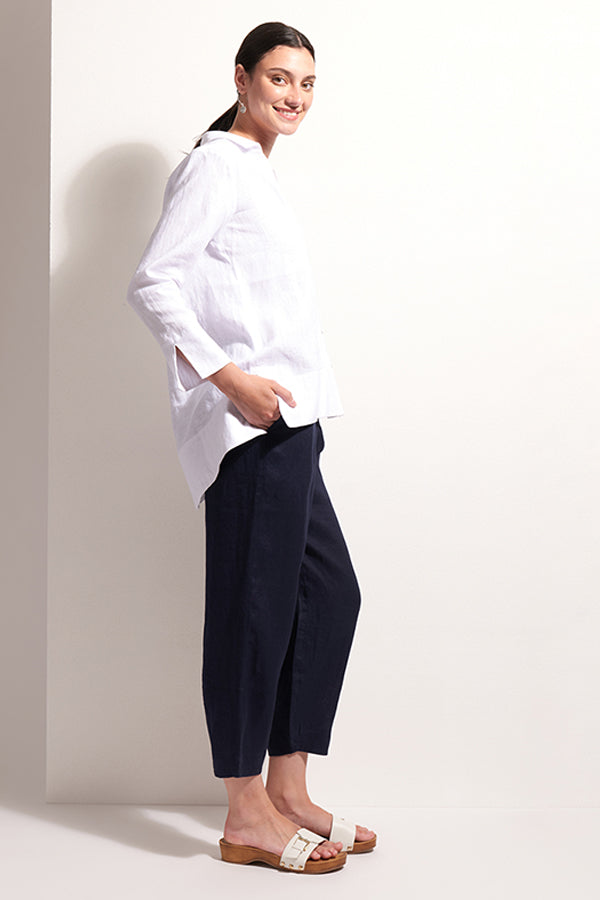 Experience effortless sophistication with the Jubilant Pant. Designed with a flat front waist and an elasticated back waistband, these linen pants combine comfort and style in a pull-on silhouette. Featuring side and back pockets and a flattering barrel leg shape, they are perfect for travel or relaxed weekends, offering versatility without compromising on elegance.