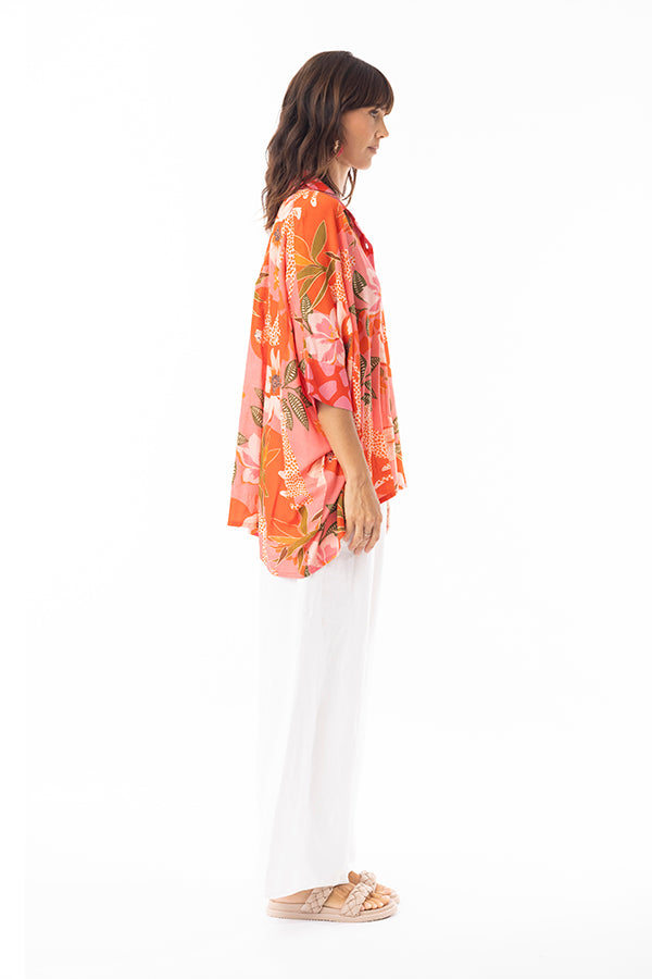 Awaken your inner muse with the dreamy Aria Oversize Top. Featuring a beautiful rose dusk print, this top offers a relaxed silhouette with 3/4 sleeves, a classic collar, and a convenient button-through front, designed for effortless style and creative flow.