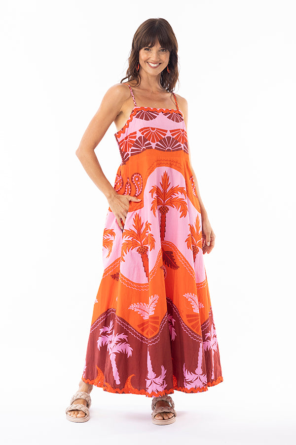 Fall in love with the sea bliss Celeste Orange Strappy Dress. Its flowing silhouette and delicate straps give the dress a playful, airy feel, perfect for sunny days and warm evenings. Whether you're attending a garden party or enjoying a seaside stroll, this dress offers a fun look that is both simple and chic with its oasis on the Sahara print.