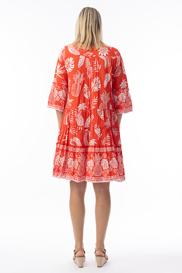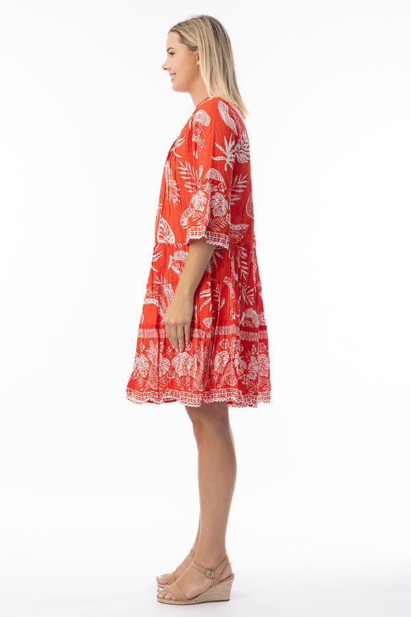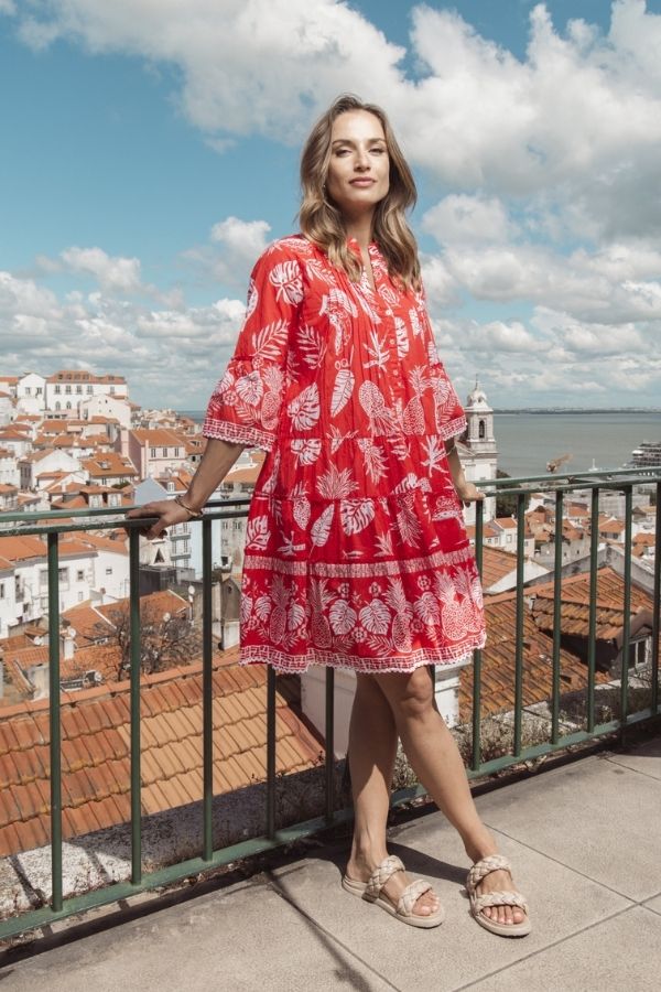 Ampifly your summer flair with the Comodoro Red Frill Sleeve Dress! Featuring a vibrant mix of colour and print, this dress radiates summer vibes. The A-line knee-length design with playful ruffles and relaxed sleeves ensures both comfort and style, making it your go-to outfit for summer days out.