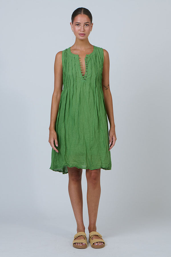 This sleeveless dress features a notched neckline with button accents and soft pleats that flow into a relaxed A-line silhouette. The artfully gathered 100% crinkle cotton creates natural texture and movement, offering a perfect balance of refined style and all-day comfort.