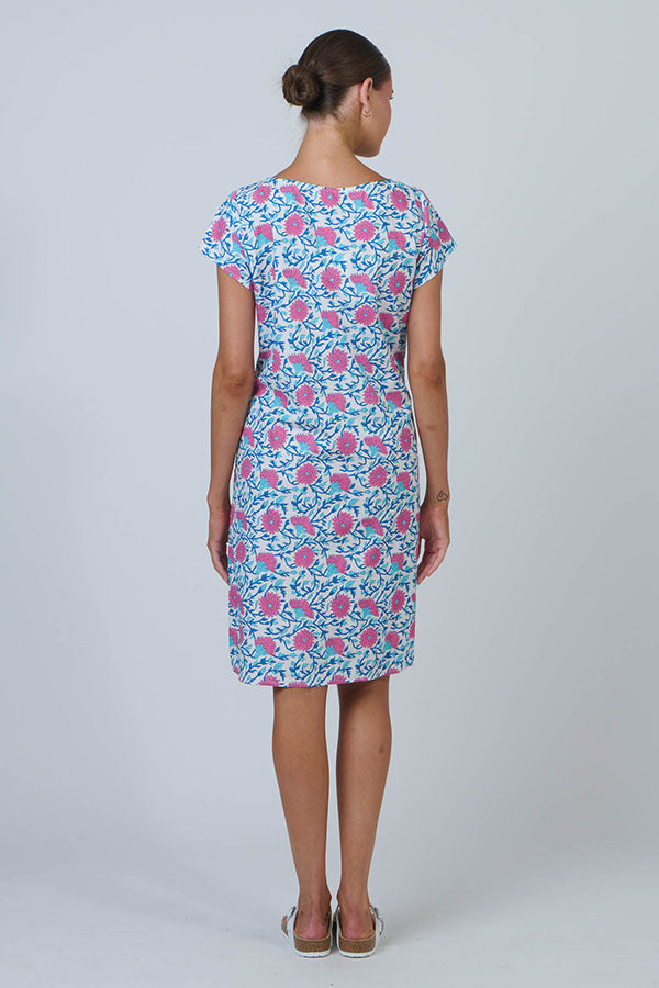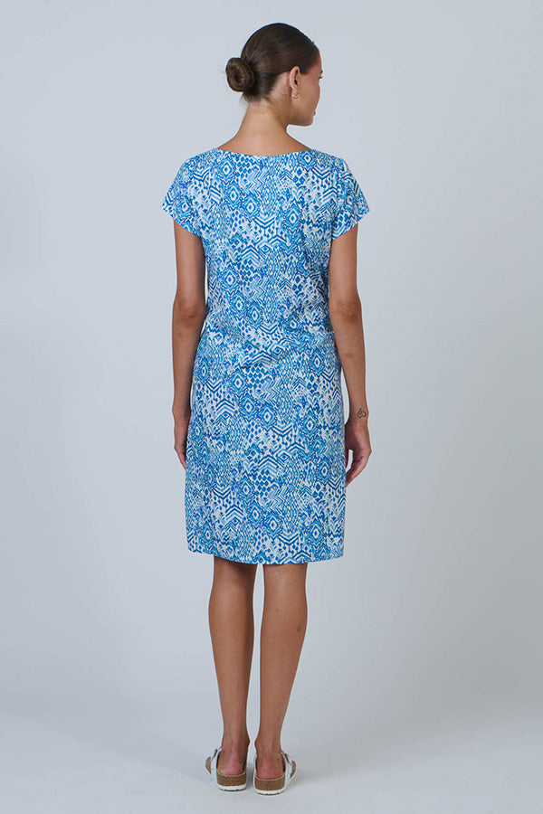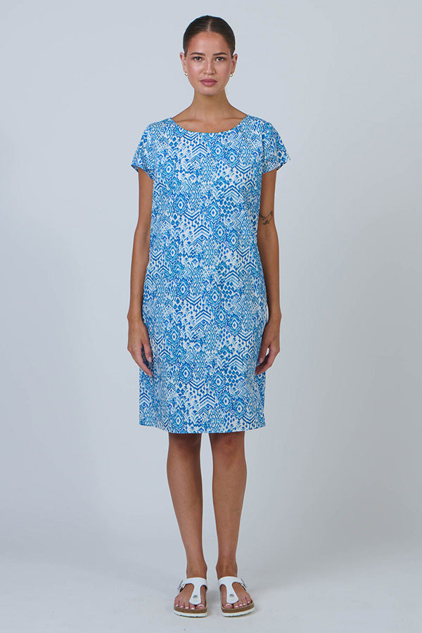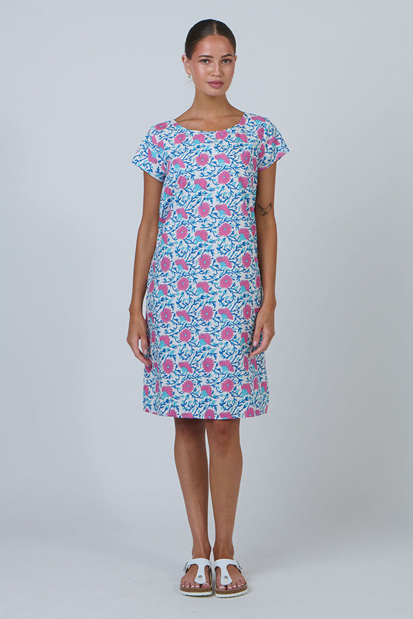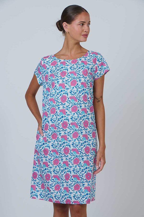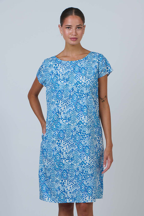 Slip into pure comfort with this easy shift dress, featuring a simple round neckline, subtle cap sleeves, and a straight silhouette that gently skims the body. Designed with practicality in mind, it includes convenient side pockets—making it the perfect versatile piece that transitions effortlessly from beach cover-up to casual day dress with just a change of accessories.