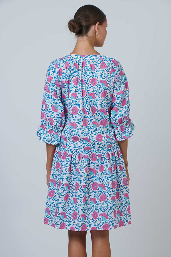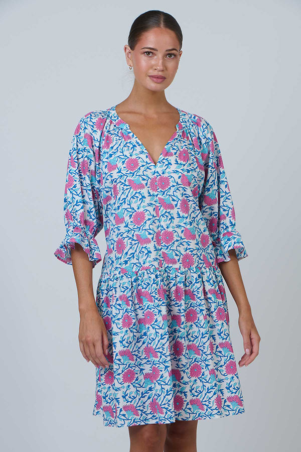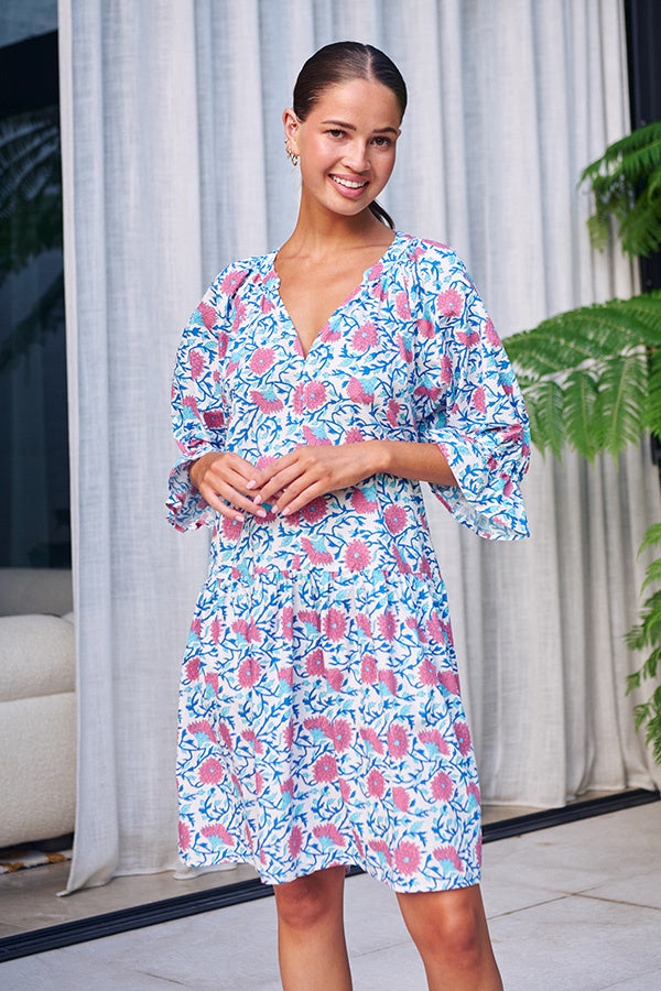 Embrace summer’s charm in the Late Bloomers dress, crafted from breathable 100% cotton and adorned with our signature floral print. This knee-length style features a flattering V-neckline, elegant three-quarter sleeves with delicate ruffled cuffs, and a relaxed silhouette—perfect for warm-weather occasions.