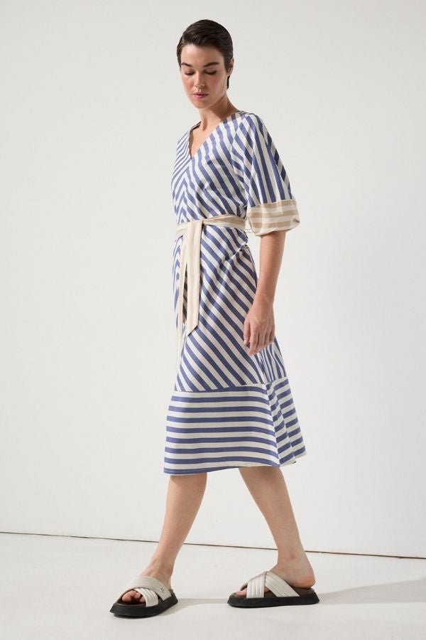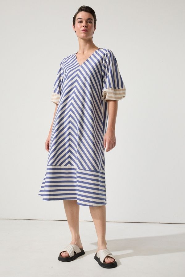 The Spliced Stripe Dress brings fresh energy to a timeless shape. Made from 100% cotton, it’s breathable yet structured, designed for summer ease with just the right amount of polish. Exclusive yarn-dyed blue stripes are spliced into contrasting panels, creating a dynamic play of direction and colour. Cream and white trims at the sleeve hem and matching waist tie break up the pattern, highlighting the waist while keeping the look relaxed. With functional inseam pockets and a flattering calf-length finish, this V-neck dress is a standout piece that moves easily from casual days to styled-up occasions.
