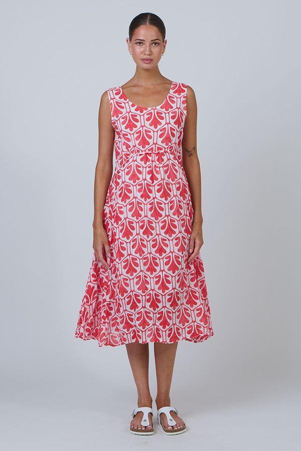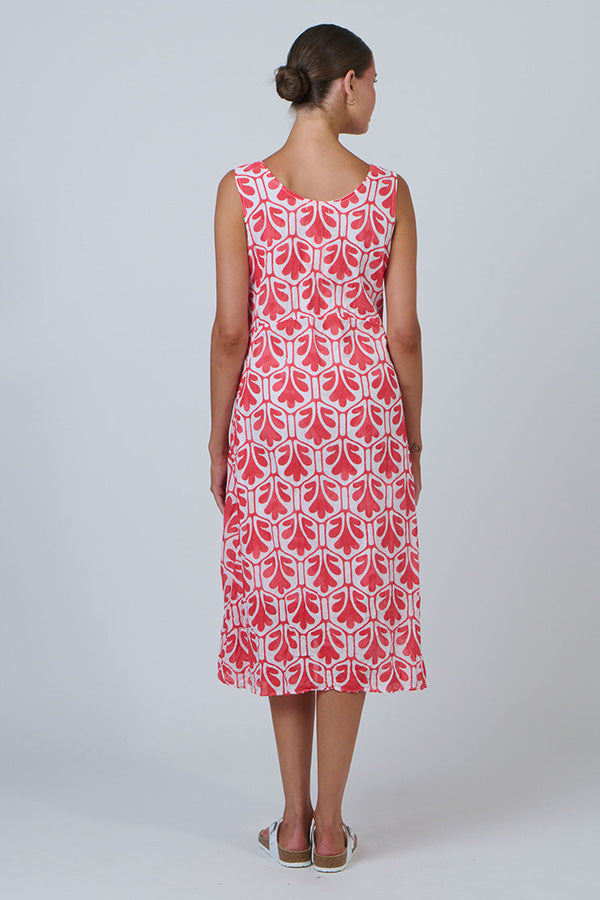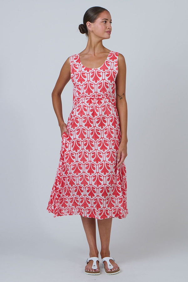 Light, flowing, and flattering, this dress features a sleeveless silhouette, classic scooped neckline, and a defined waist that flows into a breezy A-line skirt. Practical side pockets and a subtle high-low hemline add movement, while the lightweight 100% crinkle cotton fabric ensures comfort. Perfect for both casual and more dressed-up occasions with the right accessories.