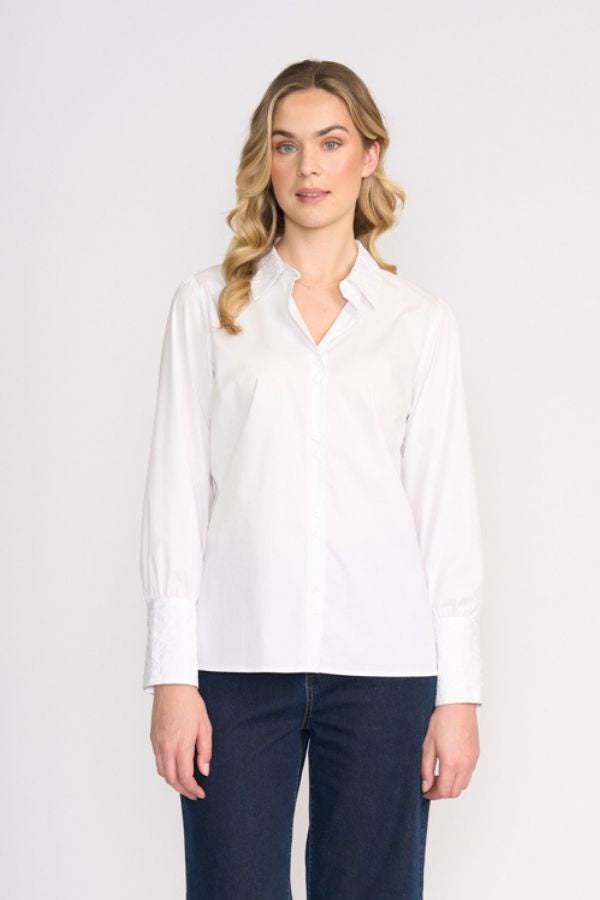 Elevate your everyday wardrobe with the gorgeous Daisy Chain Shirt, featuring delicate floral embroidery on the cuffs, collar, and yoke, trasforming a classic shirt into something special. Made from a light cotton blend, this shirt is flattering, timeless and versatile.