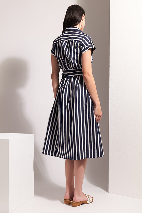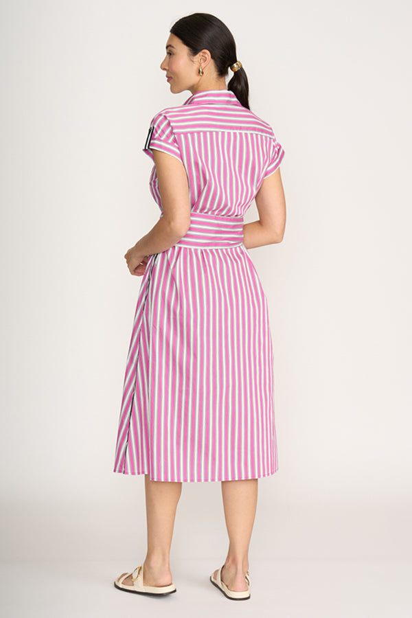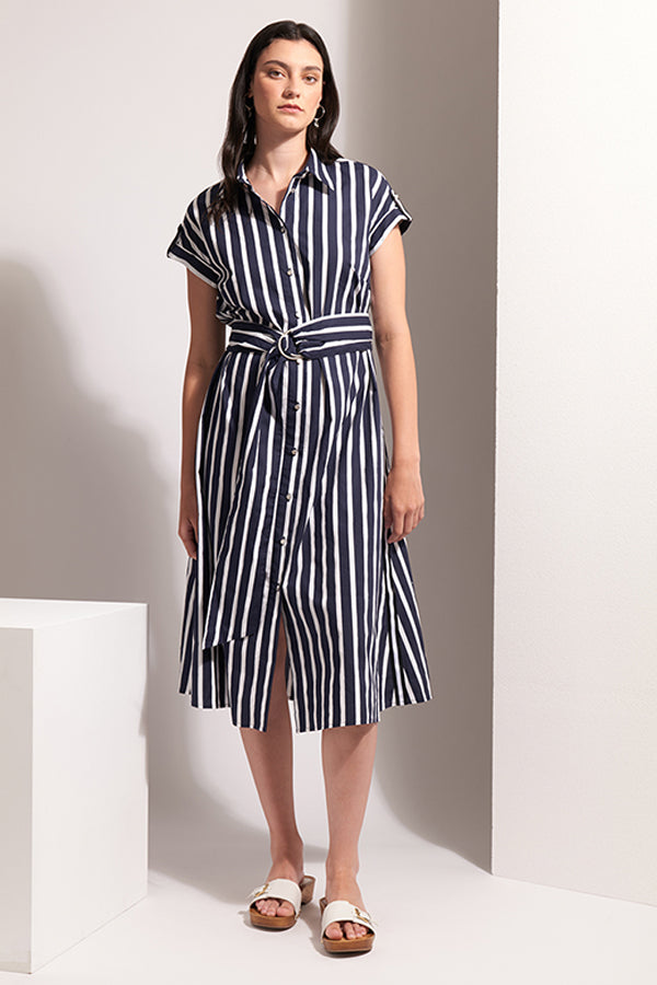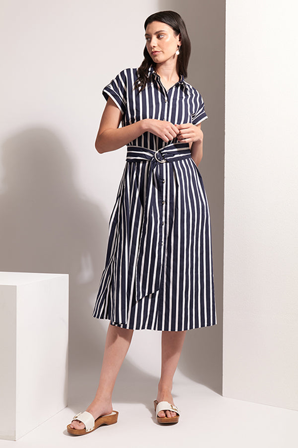 The Masterclass Dress features a full button through front, side pockets, capped tab sleeve, collar, optional fabric belt and falls to a midi length. The black and white detailing added to the side seams and sleeve tabs and silver metal buttons elevate the look.
