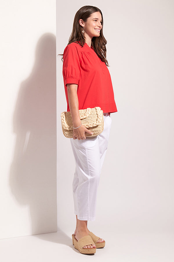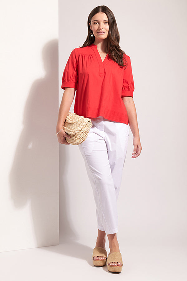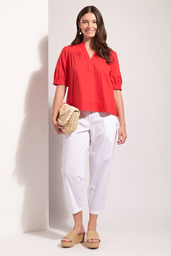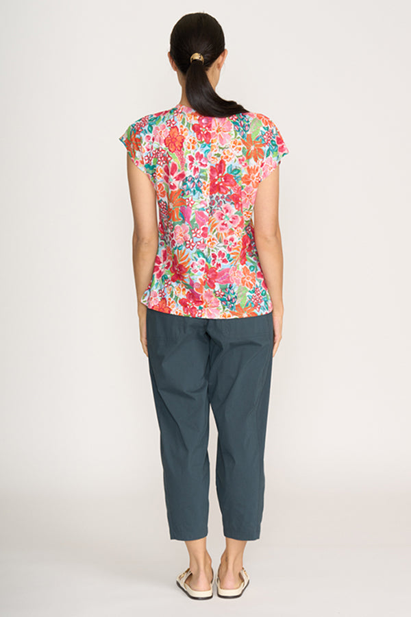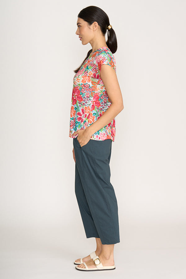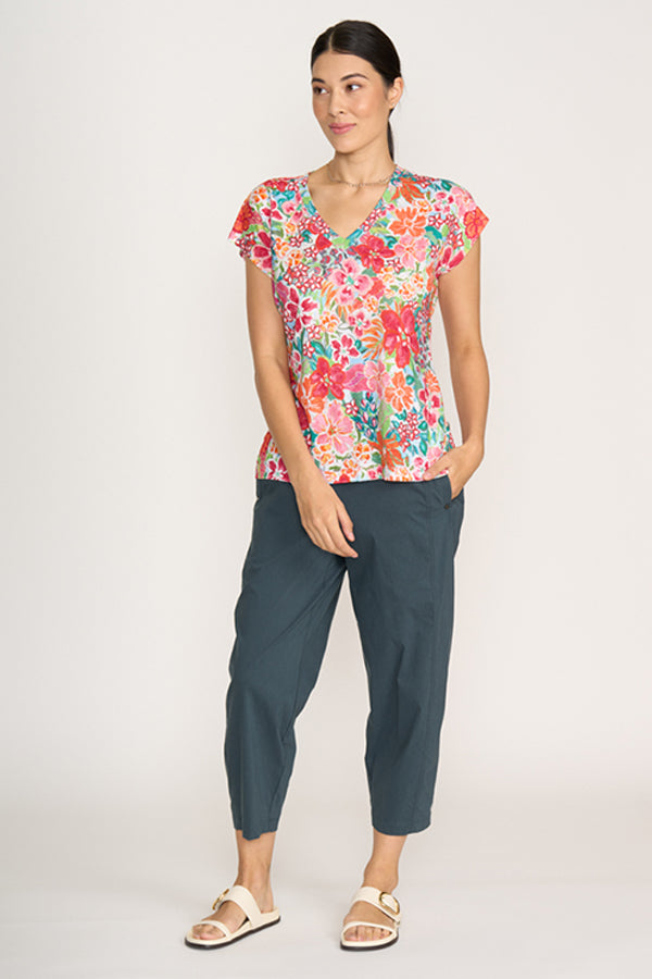 This new style from Foil in the trapeze fabric, gives a more relaxed fit through the legs finishing with a narrower hemline to draw the leg in. Front side pockets and back patch pockets add practicality and back waist elastic comfort.