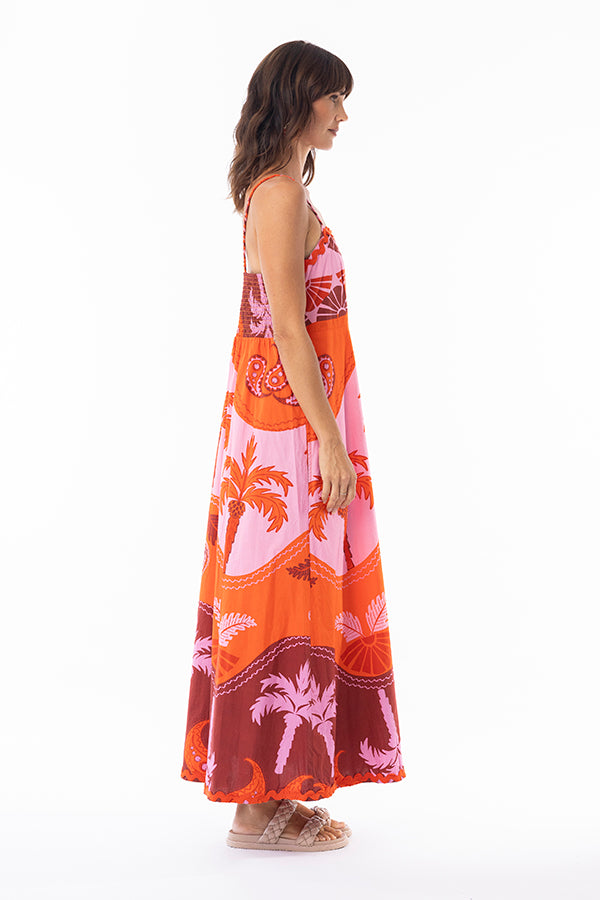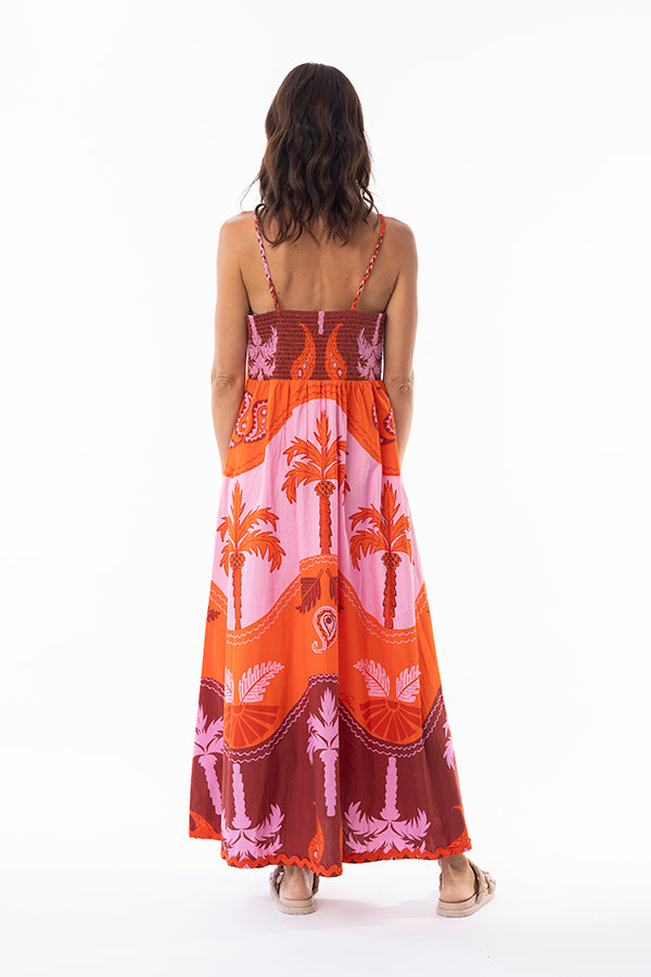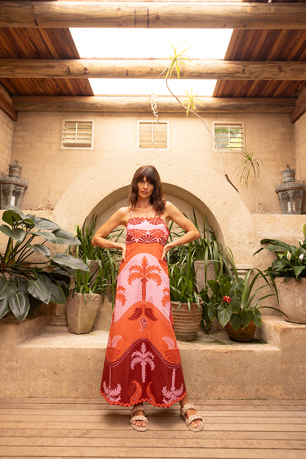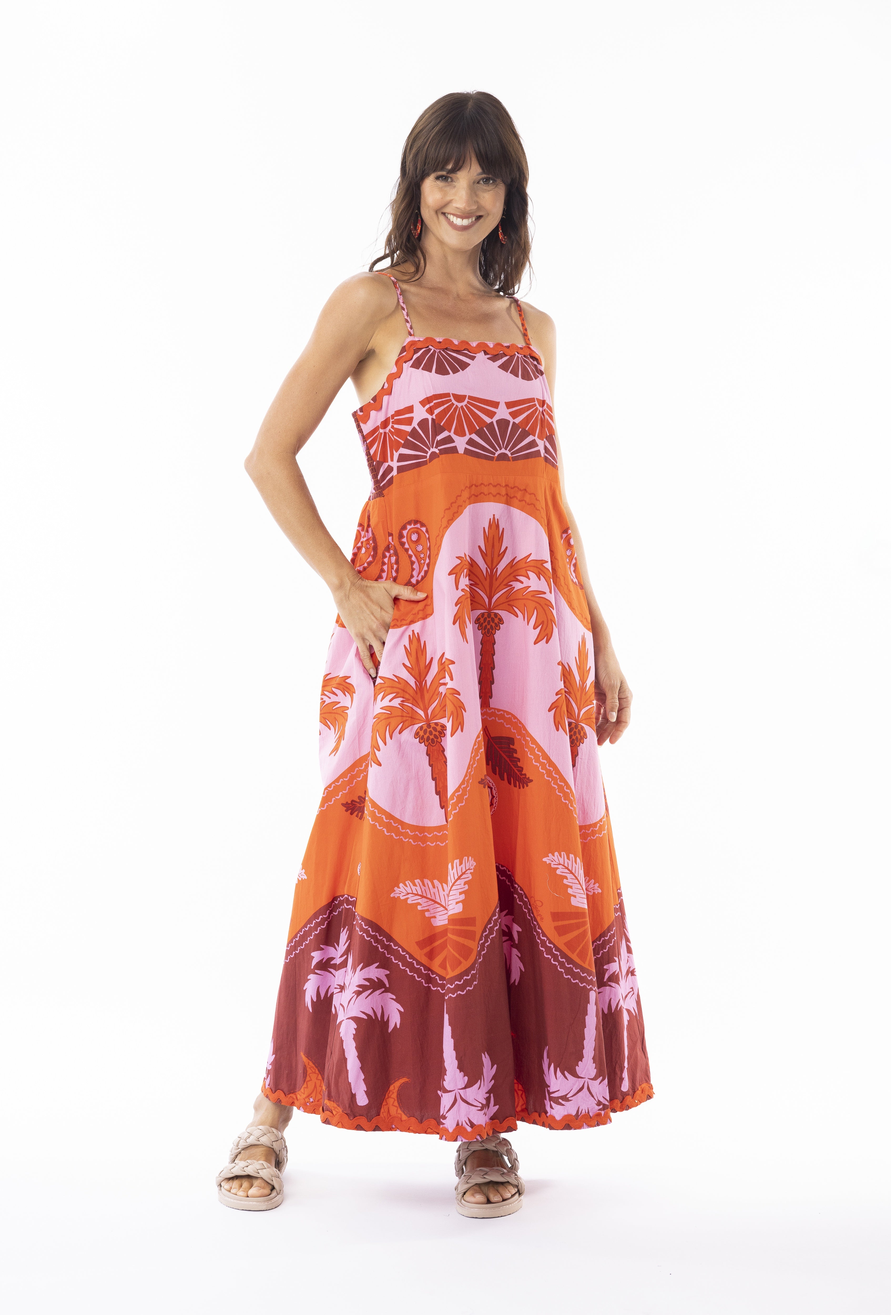Fall in love with the sea bliss Celeste Orange Strappy Dress. Its flowing silhouette and delicate straps give the dress a playful, airy feel, perfect for sunny days and warm evenings. Whether you're attending a garden party or enjoying a seaside stroll, this dress offers a fun look that is both simple and chic with its oasis on the Sahara print.