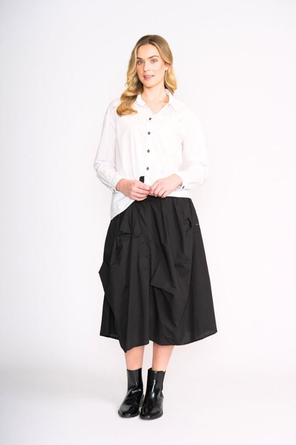 The Good Stitch skirt  with it's flattering a-line shape and waist and seam tuck detailing, will be a favourite in your transeasonal wardrobe. Featuring a flat front, elastic back waist band with pintucking, side pockets, contrast white stitching, this skirt will easily pair back with your favourite tee or knit. The seam tucks give movement and volume to the bottom of the skirt elevating the look.