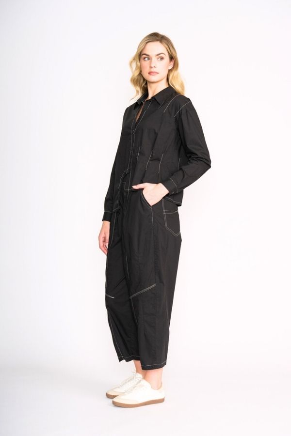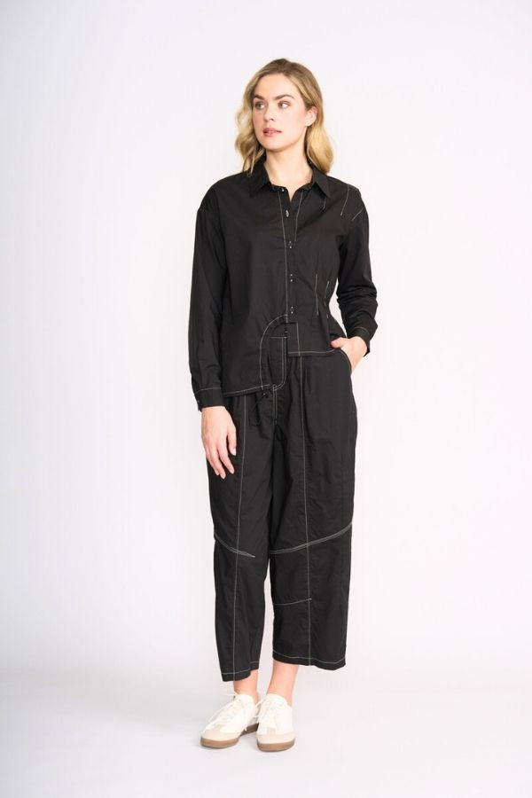 The Good Stitch Pant with it's flattering barrel shape and slightly cropped length will be a favourite in your transeasonal wardrobe. Featuring an elastic waist band, side and front pockets and contrast white stitching, these pants will easily pair back with your favourite tee or knit.