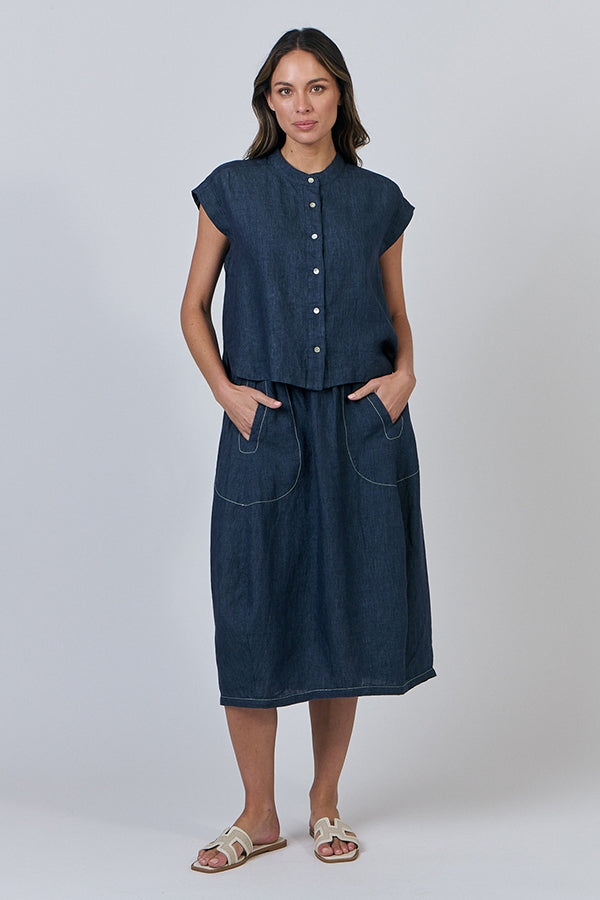 The Poseidon Tulip Skirt is a stylish midi skirt featuring an elastic waist and a flattering tulip shape with front side pockets. With lovely feature panels on both the front and back, it brings a fresh twist to a timeless silhouette. Perfect for elevating any outfit.
