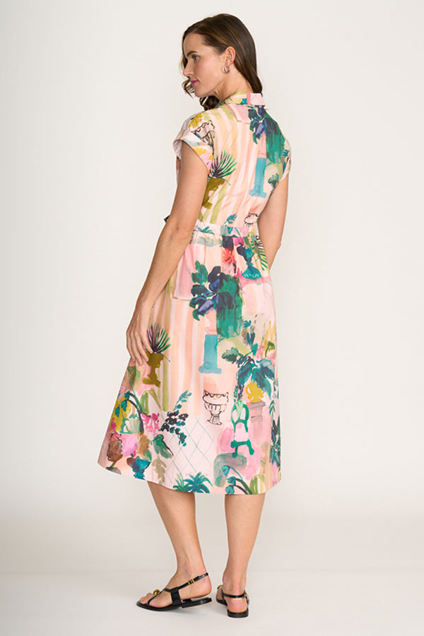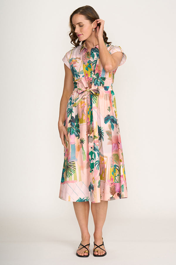 A pretty cotton shirt dress with collar and button-through front. It features an adjustable tie waist and cap sleeve foreasy every day dressing.
