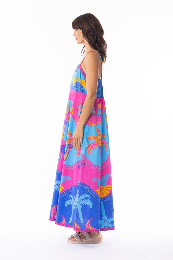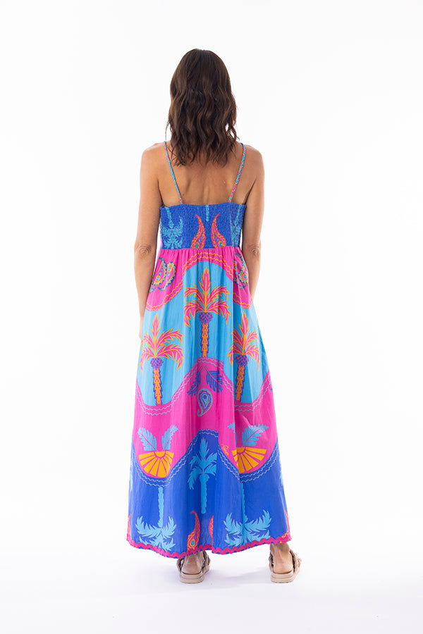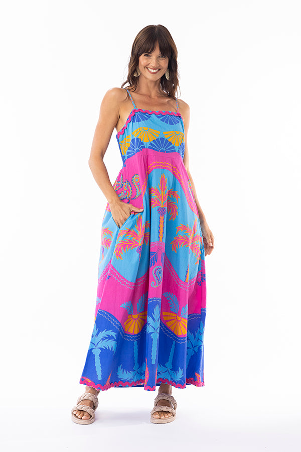 Fall in love with the sea bliss Celeste Blue Strappy Dress. Its flowing silhouette and delicate straps give the dress a playful, airy feel, perfect for sunny days and warm evenings. Whether you're attending a garden party or enjoying a seaside stroll, this dress offers a fun look that is both simple and chic with its oasis on the Sahara print.