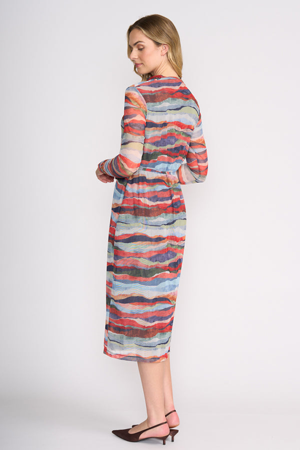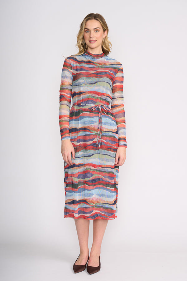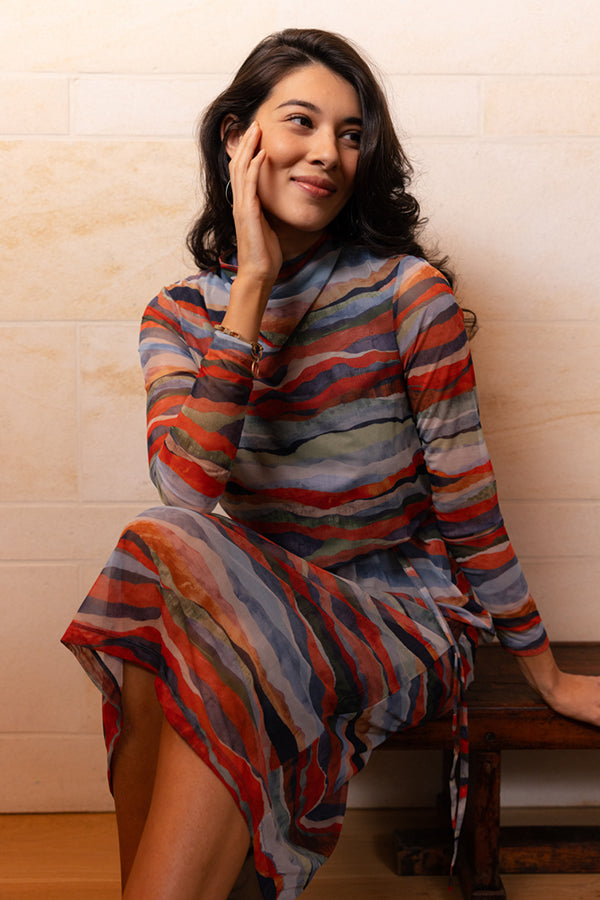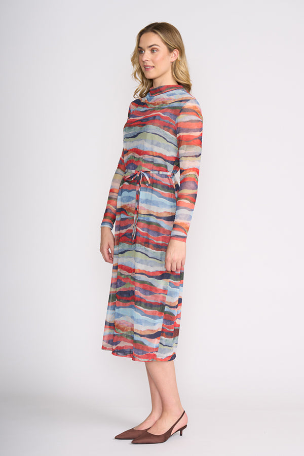 A striking statement piece, the Foil Sheer Fun Dress features an eye-catching abstract print in rich, layered tones. Crafted from lightweight stretch mesh with lining, it drapes beautifully while offering a flattering, body-skimming silhouette. The soft cowl neckline and waist tie add shape and elegance, making it perfect for both day-to-night styling.