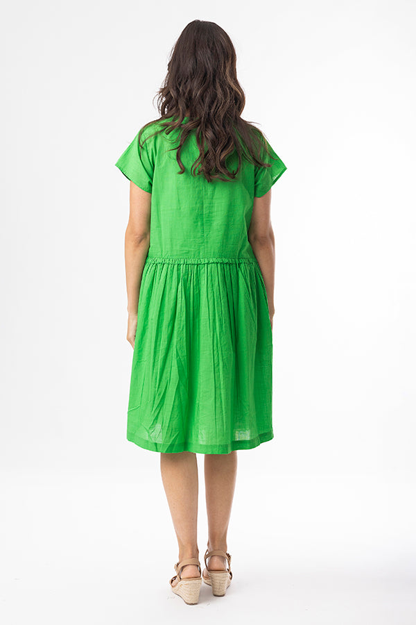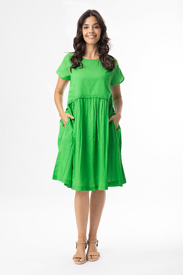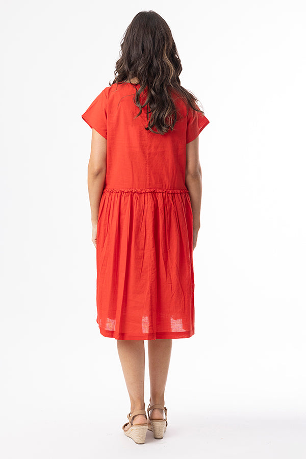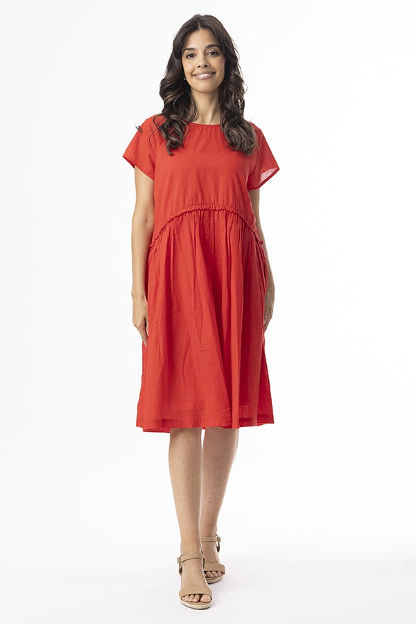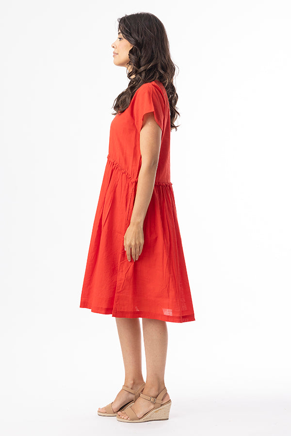 Effortless style meets everyday comfort in the Cotton Slub Essentials Dress. Made from 100% organic cotton, this dress offers a soft, breathable feel with a naturally textured finish. The gathered seam at the waist creates a relaxed yet feminine silhouette, while short sleeves and side pockets add everyday practicality. Perfect for Christmas Day!