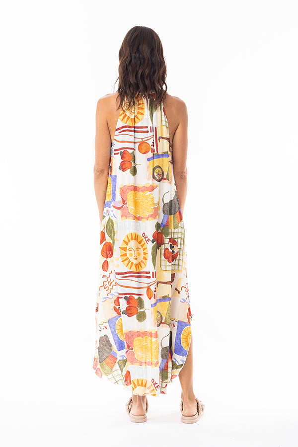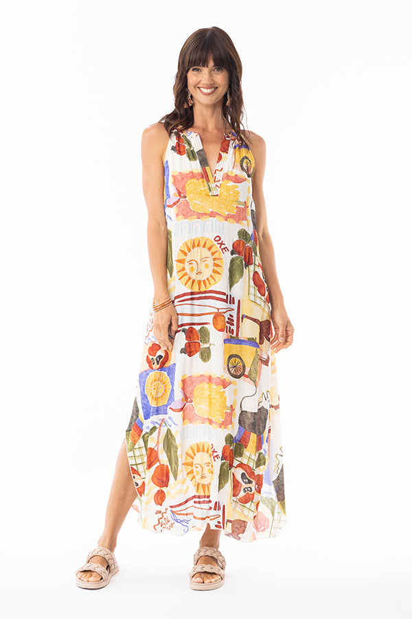 Grace meets golden hour in the Felicia Sleeveless Dress. Its effortless simplicity, adorned with a sun-kissed soleil print, creates a truly radiant look. This sheer maxi dress features a modern side slit and a unique Mandarin slit neckline with delicate edging, ensuring a touch of refined elegance.