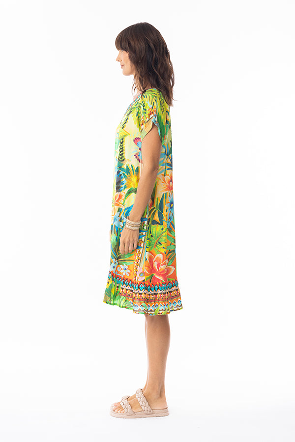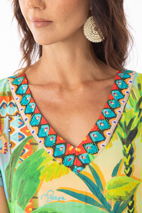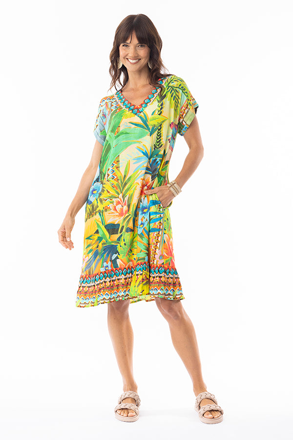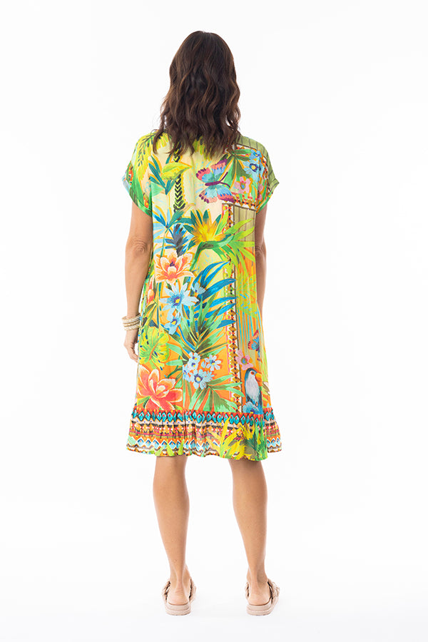 Adorn your soul with the breathtaking Georgia Frill Short Sleeve Hem Dress. Gathered seams under the bust fall into a-line layers with its bejewelled turquoise accents, wild escape print and waved trim to create a cute and flattering silhouette. Intricate florals, vibrant colours, and frill details make this top a unique addition to your summer wardrobe!