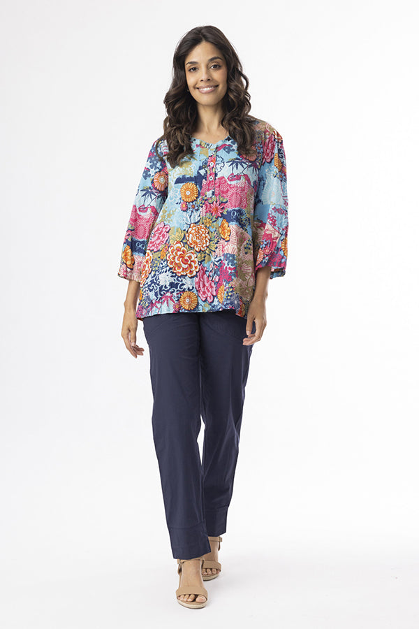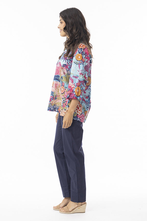 The Ikebana Frill Neckline Top, designed with three-quarter sleeves, bold prints, and a flattering v-neckline, adds a playful touch to any outfit. Perfect for adding a pop of colour to your look, it's a must-have for your everyday wardrobe.