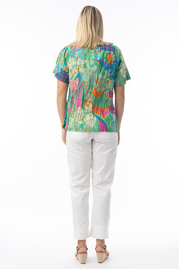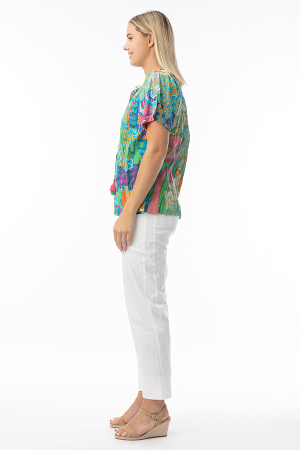 Channel effortless style with the Santa Cruz Tie Top. Crafted from organic cotton, this top features a relaxed fit, short sleeves, an open neckline with tassel details and vibrant print. Elevate your summer wardrobe with effortless style.